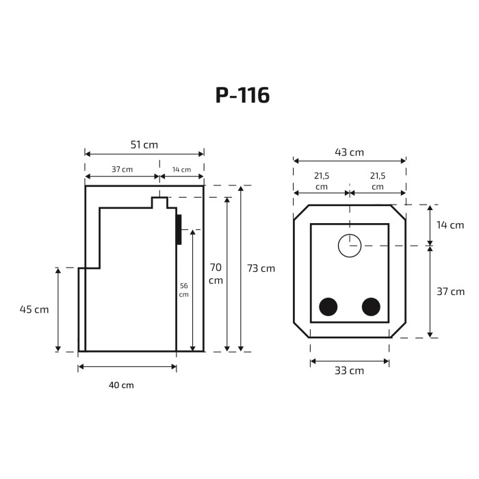 Krosnelės aukštis - 73 cm, plotis - 61 cm, gylis - 51 cm.