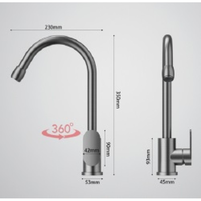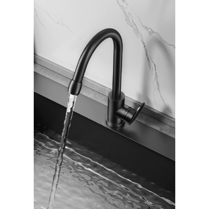 Vienos rankenėlės virtuvinis maišytuvas lenktu snapu, sukiojamu 360 laipsniu kampu.