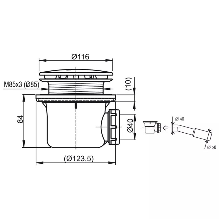 Dušo padėklo sifonas su metaliniu, juodu dangteliu.